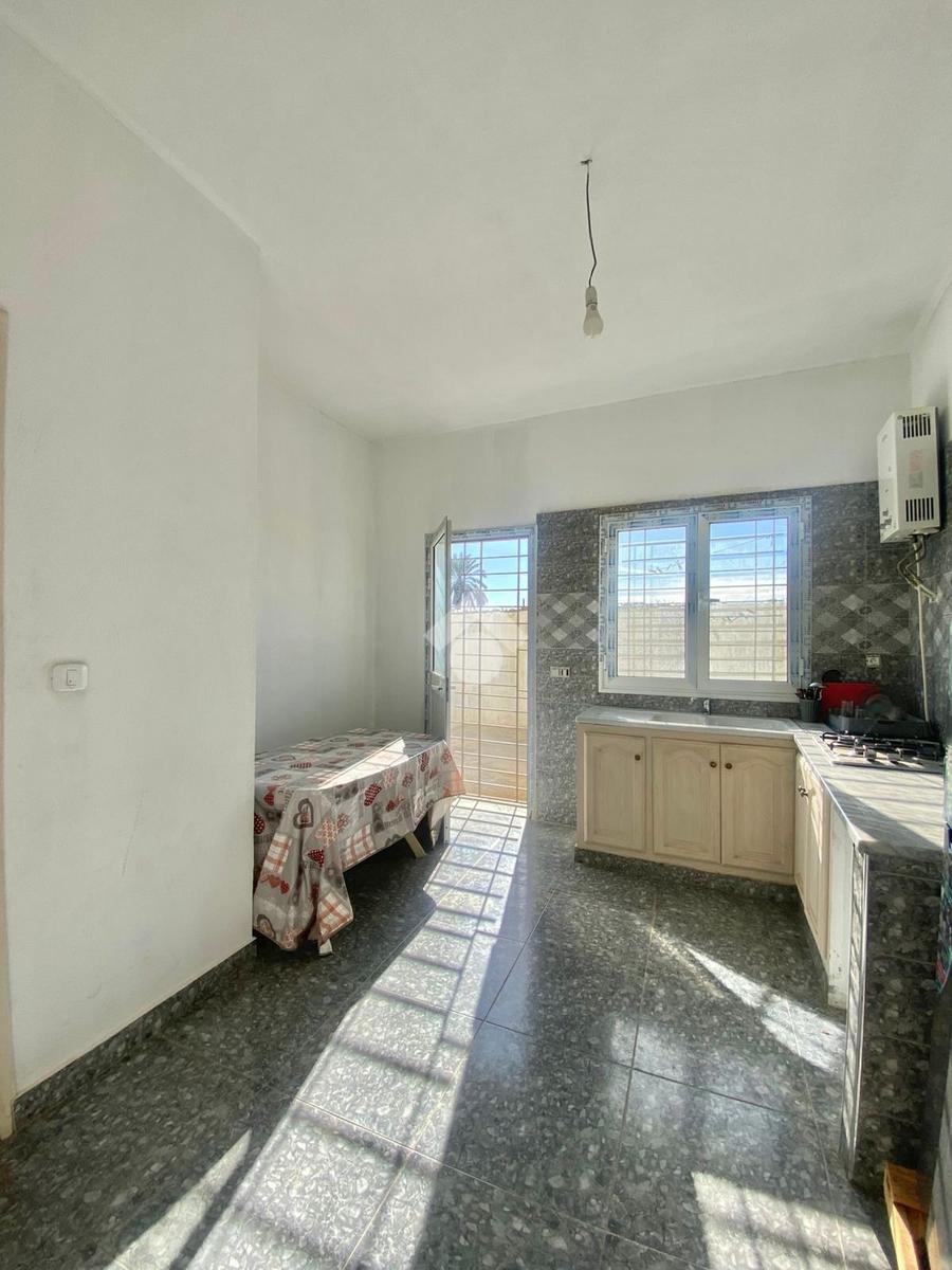 La cuisine est équipée de rangements fonctionnels et donne accès à un jardin ainsi qu’à un espace extérieur libre, idéal pour profiter des beaux jours.